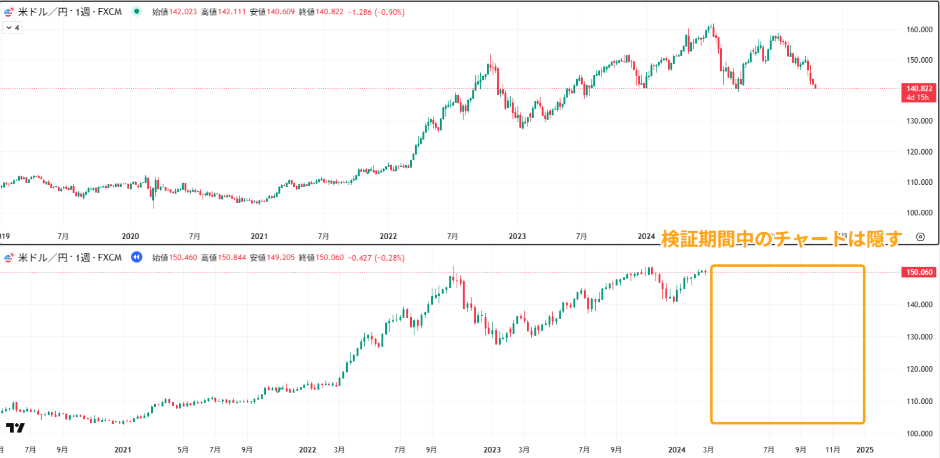 未来の値動きがわかっていると、「この後上がるとわかっているからエントリーできる」などのバイアスが生じ、実際のトレードで再現できない過信を生む可能性があります。