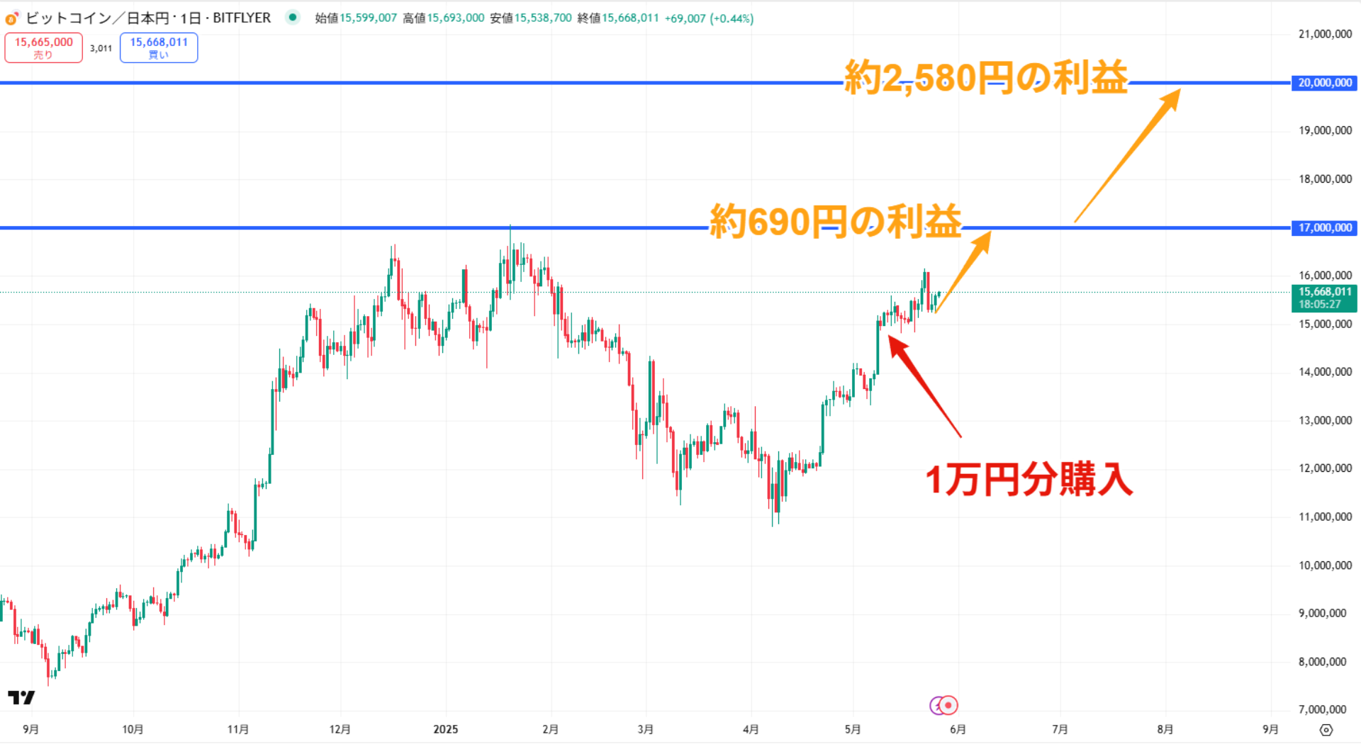したがって、円建てビットコインの価格が過去最高値の約1,700万円に到達した場合、約690円(10,691円 – 10,000円)の利益が見込める計算になります。
