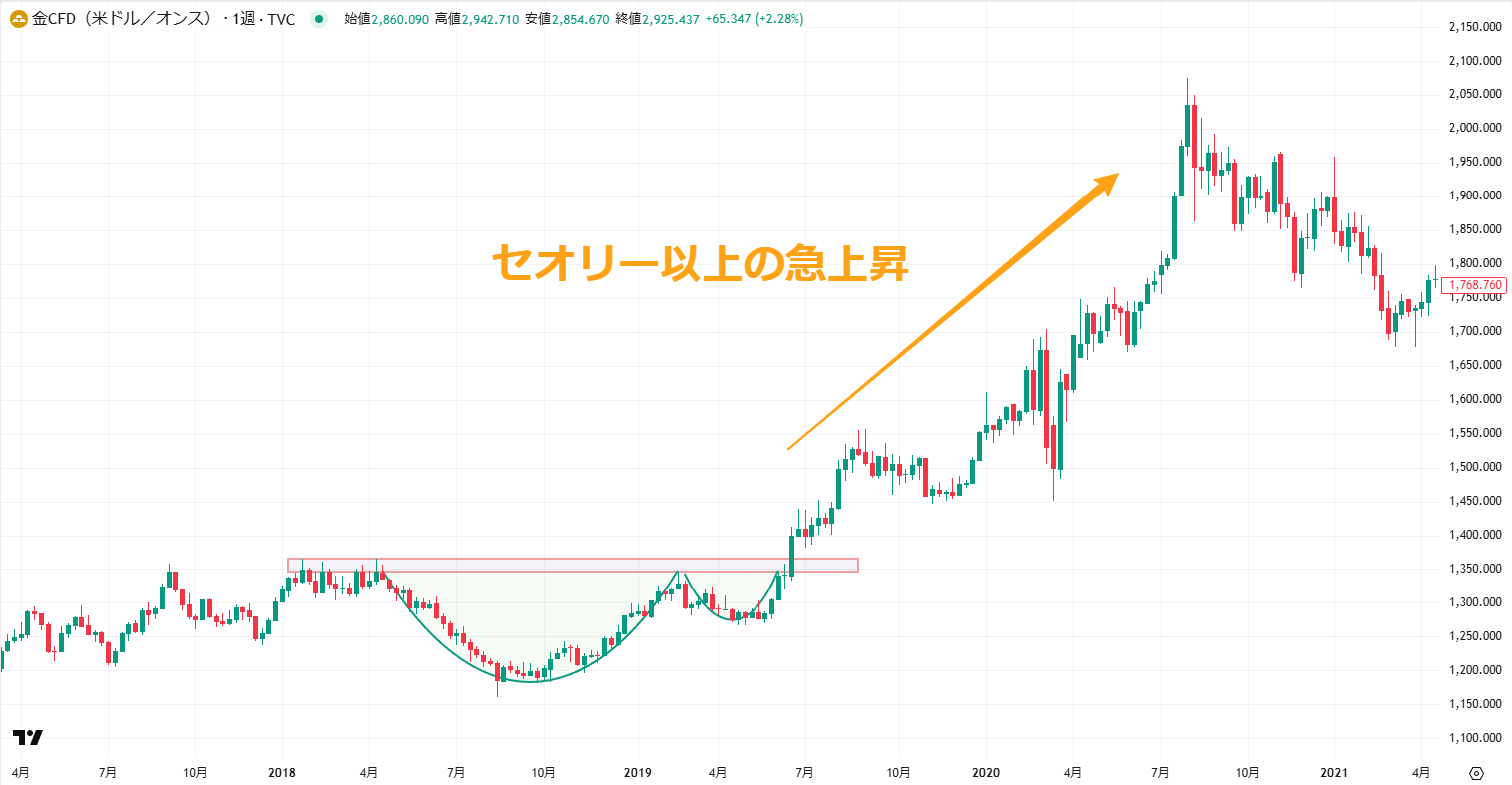 また2018年1月〜2019年6月にかけて、ドル建てゴールドで大きなカップウィズハンドルが形成されました。