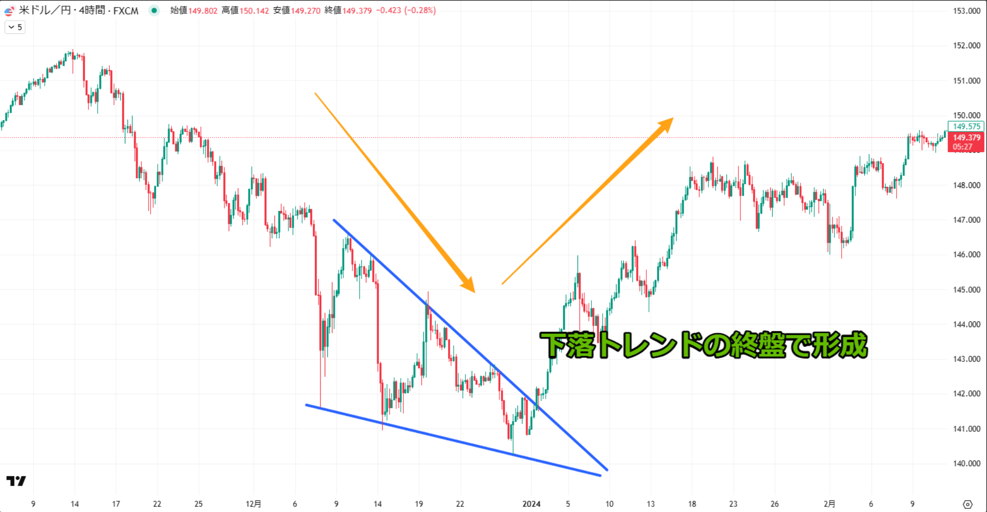 上昇シグナルのチャートパターンとして多くのトレーダーに知られているのが「下降ウェッジ」です。