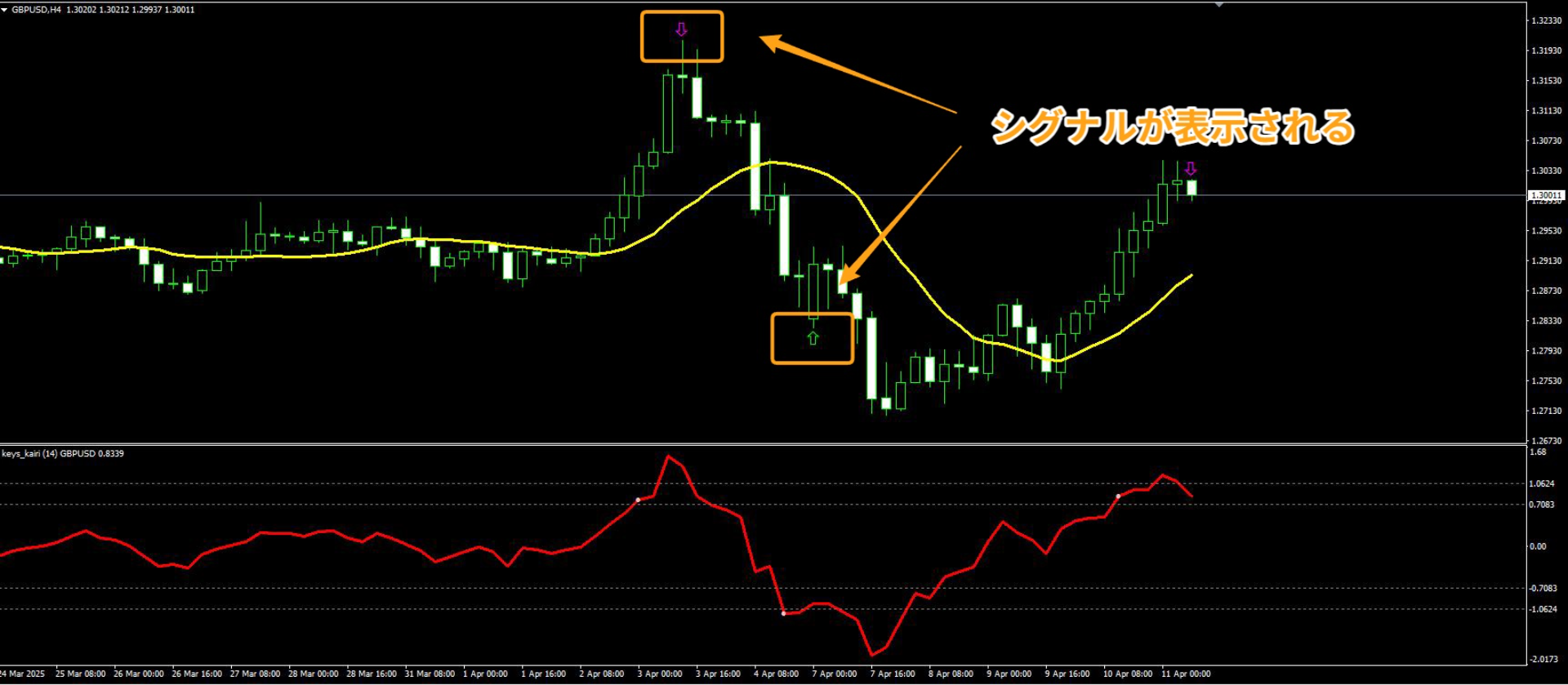 乖離が大きくなり、かつ上方乖離の場合は陰線の出現タイミング、下方乖離の場合は陽線の出現タイミングで矢印を表示してくれるので逆張り判断の精度も高まります。
