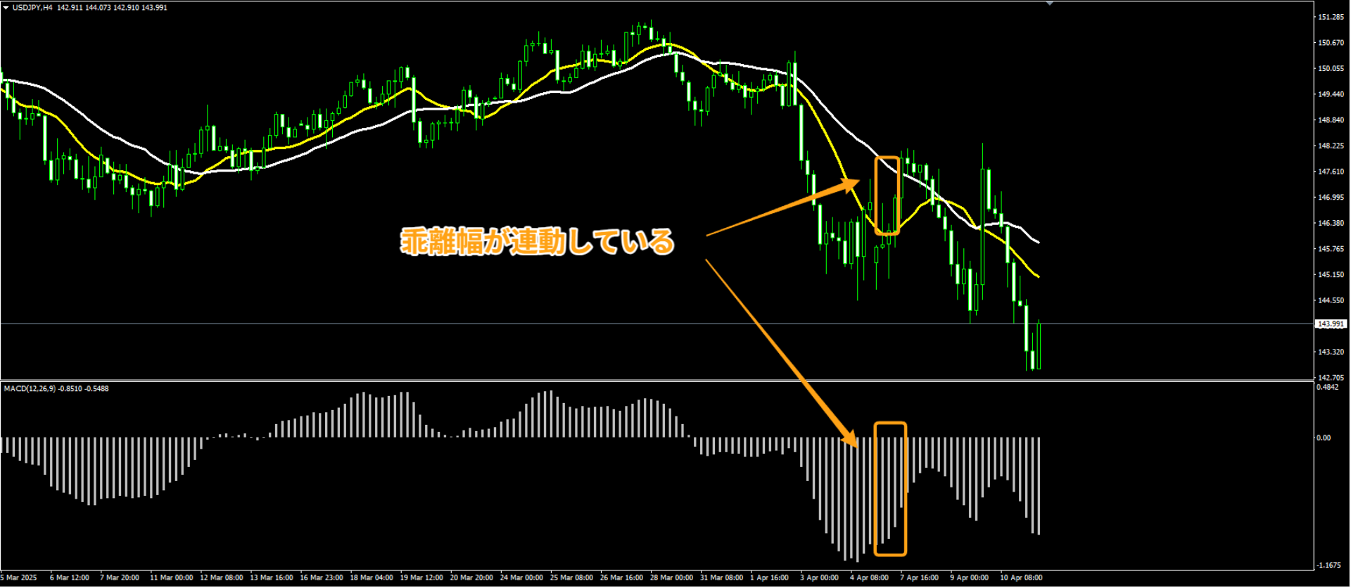 したがってMACDの設定で乖離率を確認したい移動平均線の期間を指定すると、MACDラインにて移動平均線同士の乖離を確認できるようになります。