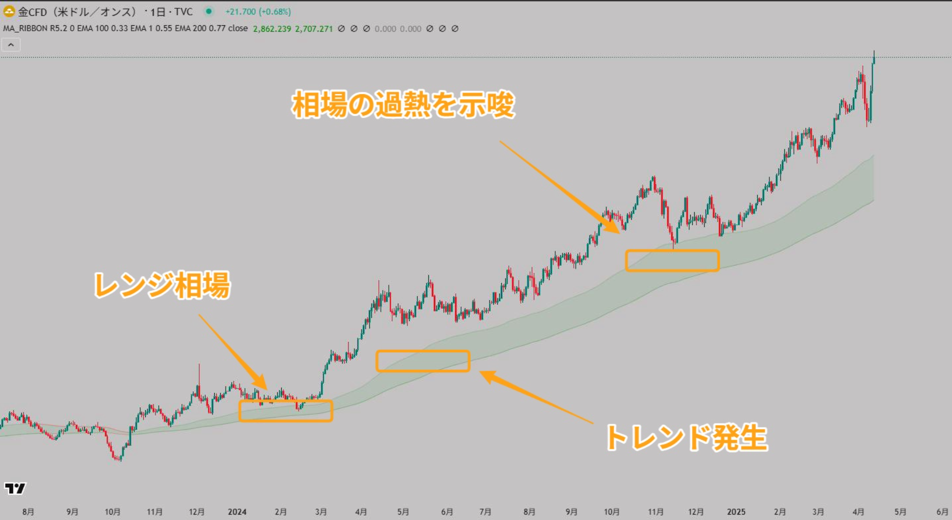 またMACDやTradingViewの「MA_RIBBON」を活用すれば、移動平均線同士の乖離も把握可能です。